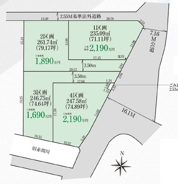 - 1区画 東:7.1m 2区画 東:7.1m 3区画 東:7.1m 4区画 東:7.1m