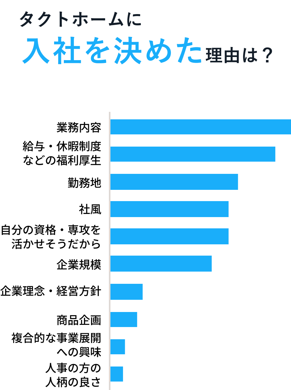 もっとタクトホームグループのことを知りたい!そんな思いに、数字で応えます。総社員数、1421人。たくさんの仲間が働く職場の姿、そして新卒の社員がどんな気持ちで働いているのかなど、タクトホームグループ社員の実情と生の声をご紹介します。