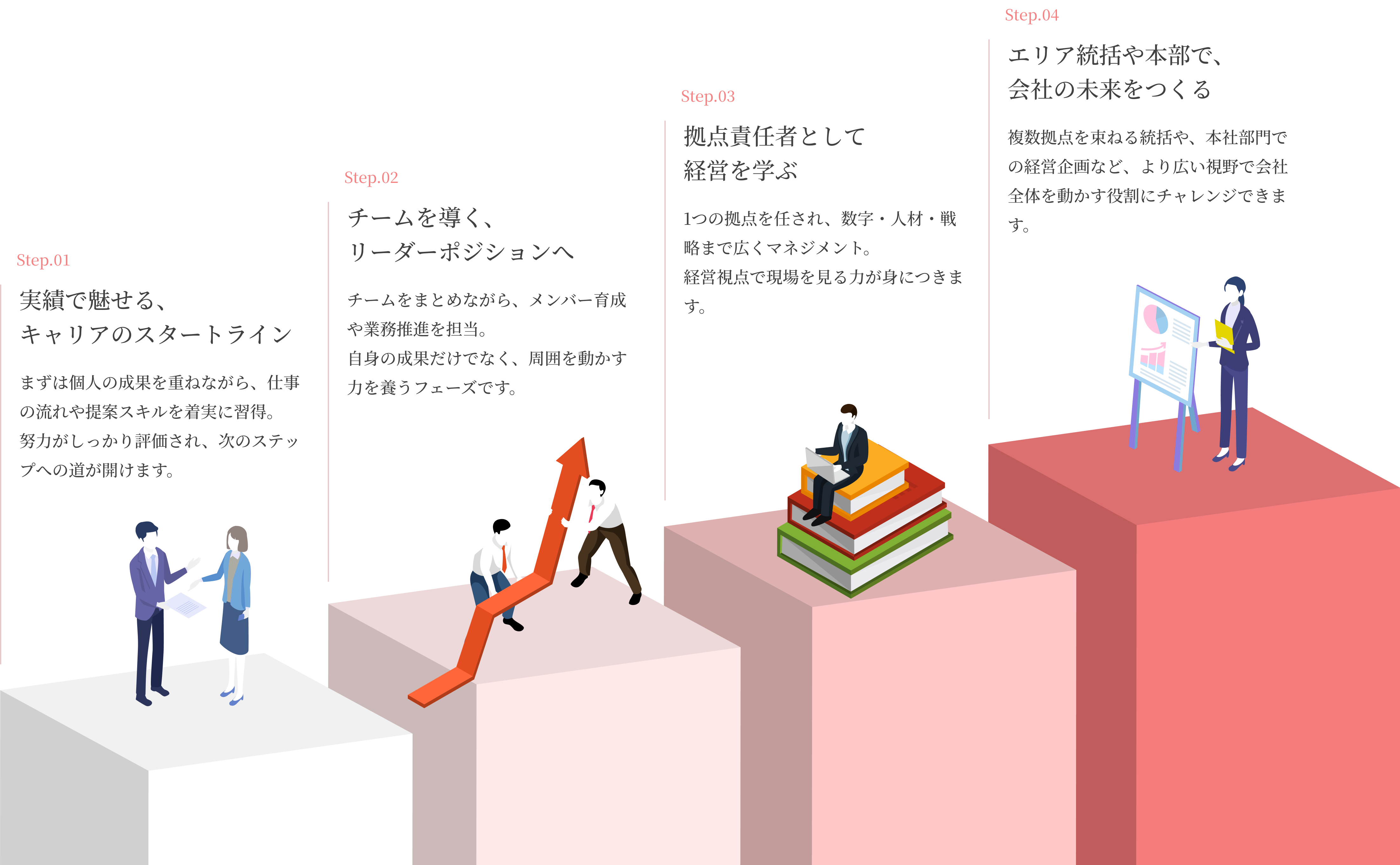 まずは現場で成果を積み重ねながら、提案力や業務理解などのビジネススキルを着実に習得。その後、チームを牽引するリーダーとしてマネジメントに挑戦し、拠点全体を任される責任者ポジションへとステップアップしていきます。