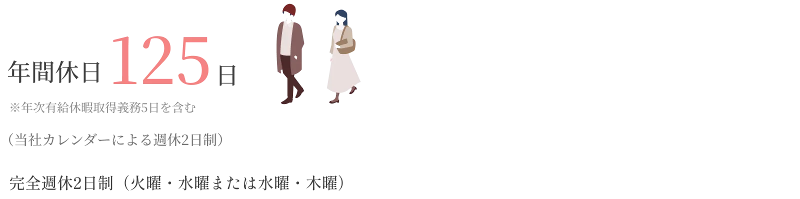 慶弔休暇 / 年末年始(冬季)休暇/ 夏季休暇 / 年次有給休暇 / 特別休暇 / 産前産後休暇 / 生理休暇 裁判員休暇 / 育児休業 /介護休業、リフレッシュ休暇
