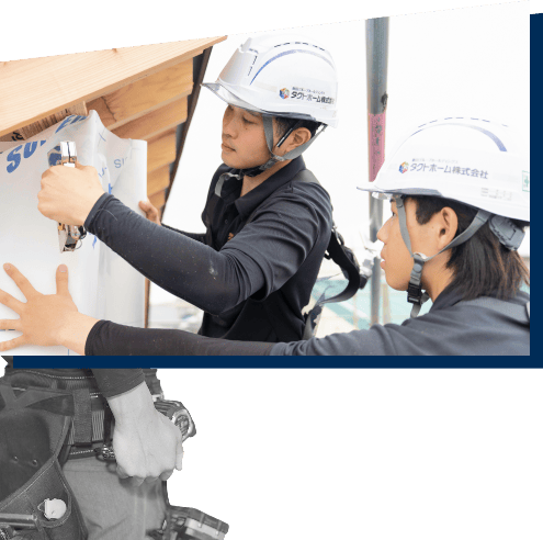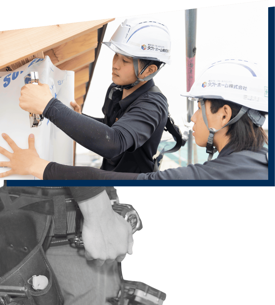 技術だけでなく「暮らしを想像する力」が求められる時代です。住宅性能表示制度最高等級の技術基準をクリアするだけでなく、その先にある住まう家族の暮らしを考え、丁寧に仕上げる姿勢。年間5,000棟の施工実績と飯田グループのスケールメリットを活かしながらも、一棟一棟への想いを大切にする“心ある仕事”ができる職人を、タクトホームは育てています。