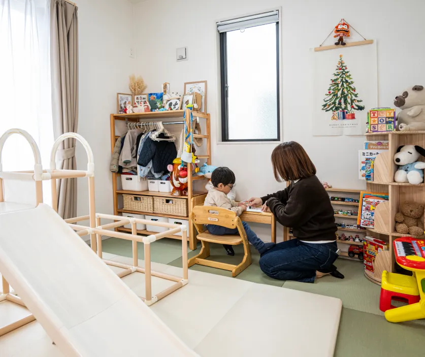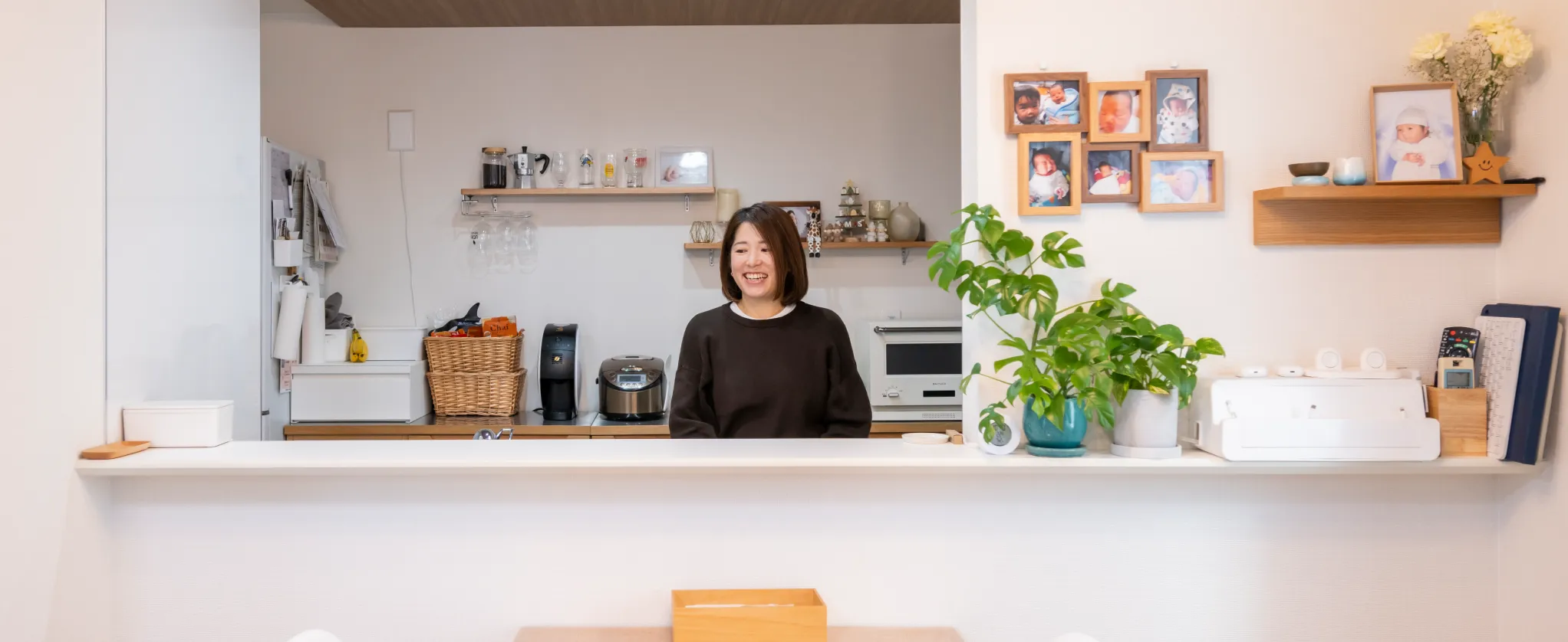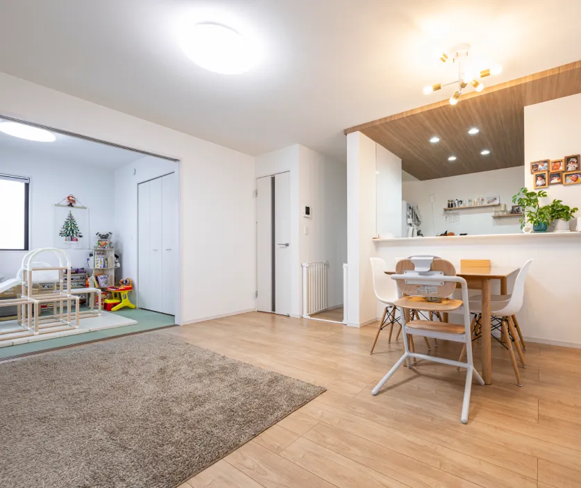 一番気に入っているのはやっぱりリビングですね。ナチュラルテイストな内装、白とアイボリーを基調とした床や建具のカラーリングが理想どおりでした。対面式のキッチンからはリビング全体が見渡せるので、家事をしながら小さな子どもの様子を見守ることができます。子育てしながら家事をするのにとても便利です。1階を中心に家族が集い、顔を合わせる時間が自然と増えました。リビングに隣接する和室は、現在末っ子の遊び場として活用していますが、風邪を引いた時の隔離スペースなど、多目的に利用できる便利なスペースです。将来的には間仕切りを外し、リビングと一体化することもアリですよね。ライフステージに合わせて変化できる間取りを選んだので、いつまでも新鮮な気持ちで住まいでの時間を楽しめると思います。