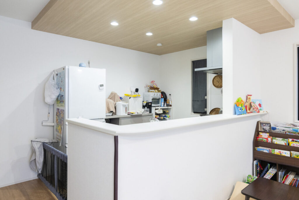 室内はシンプルでありながら、リビングのアクセントクロスやキッチンの折下げ天井など、程よく“おしゃれ”が効いている印象でした。LDKに一歩足を踏み入れた瞬間に「いいね」と夫婦の意見が一致したのを覚えています。広い2階リビングは東向きなので、冬は思った以上に暖かくとても快適です。妻はキッチンのゆとりと収納量の豊富さに満足しています。