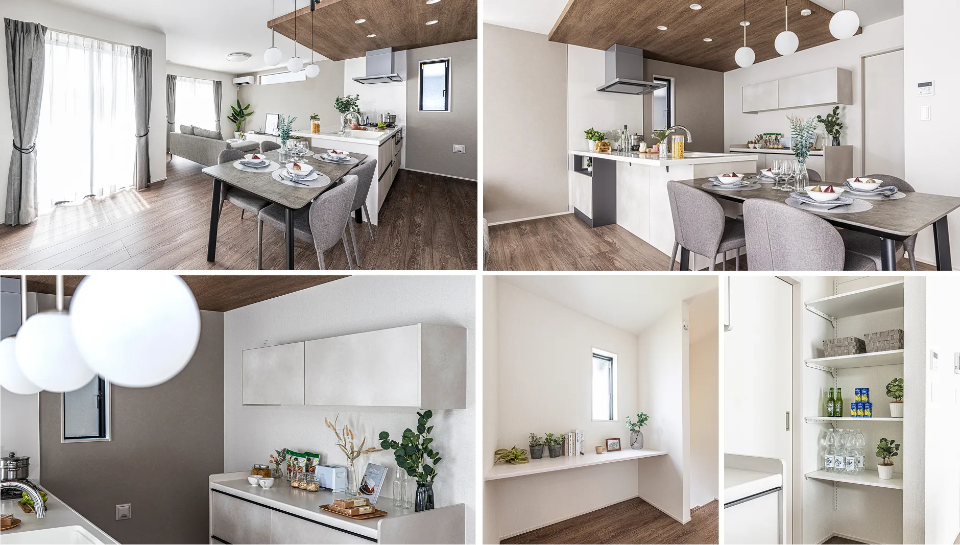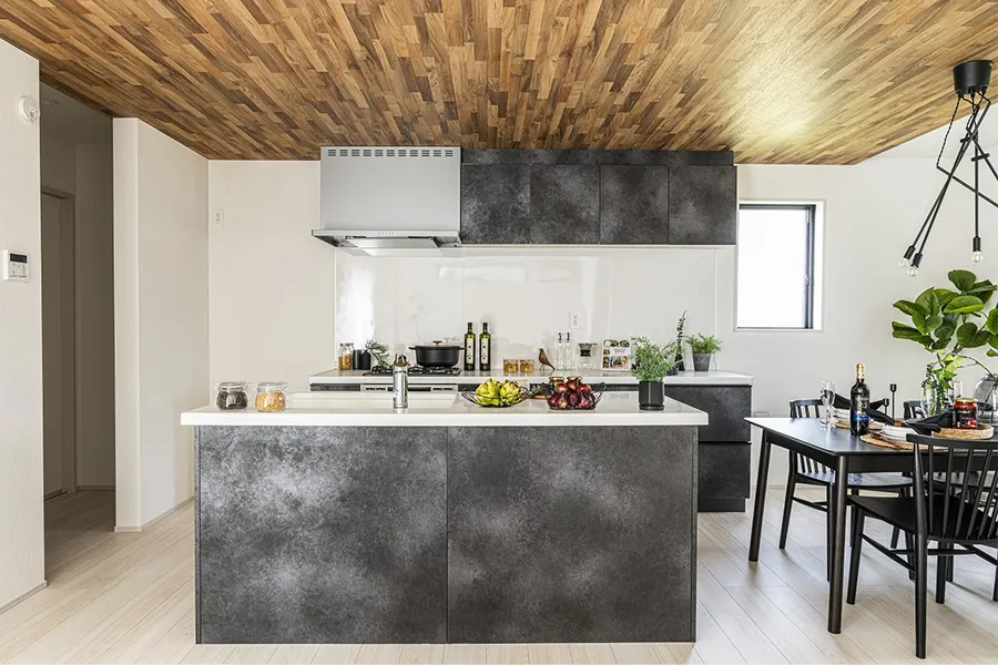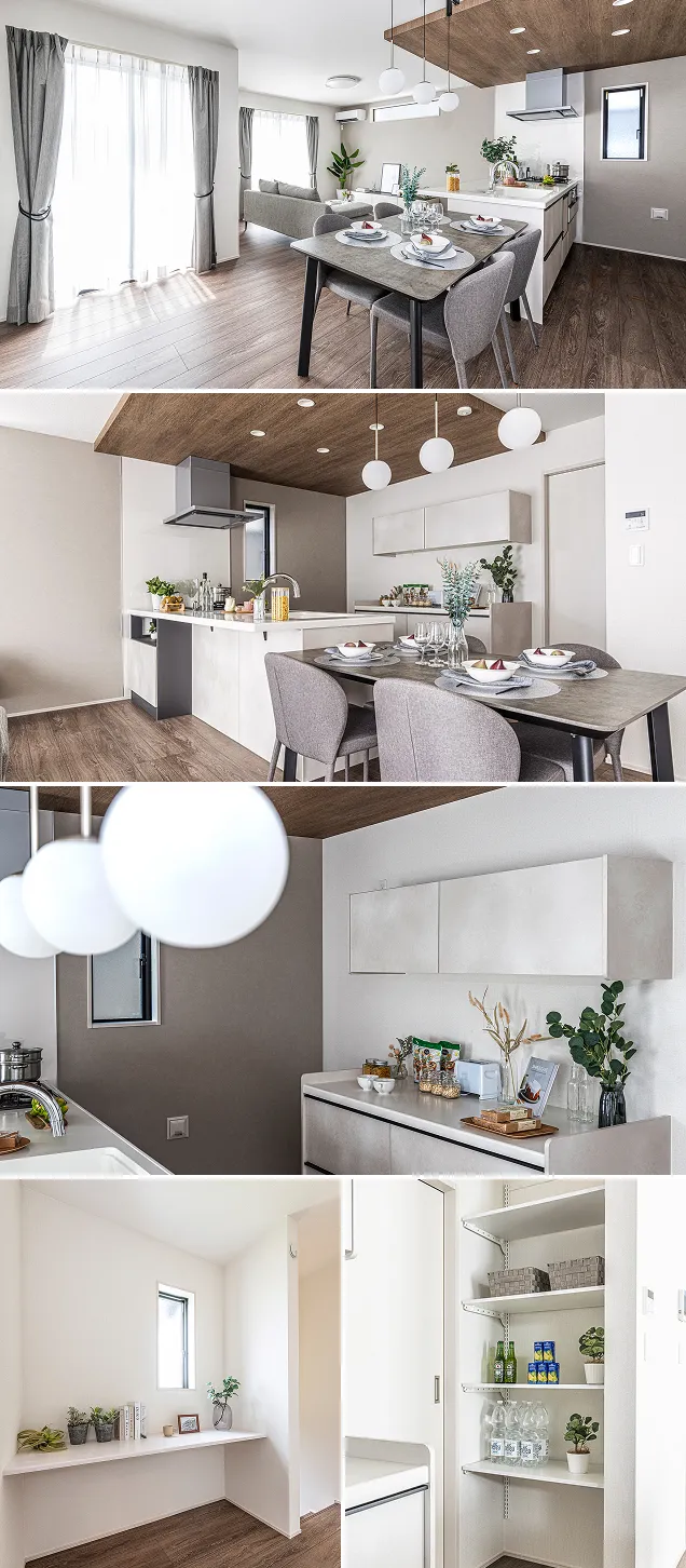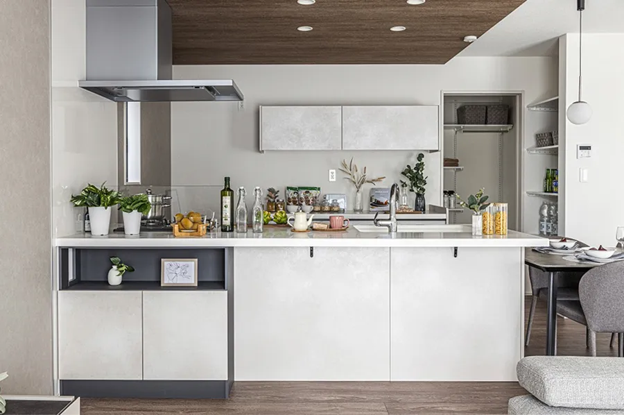 キッチン奥にパントリーを配置し、散らかりがちなキッチン周りをすっきり収納することができます。コンパクトながら広々とした印象を保つことができ、ゆとりを感じるLDKになっています。