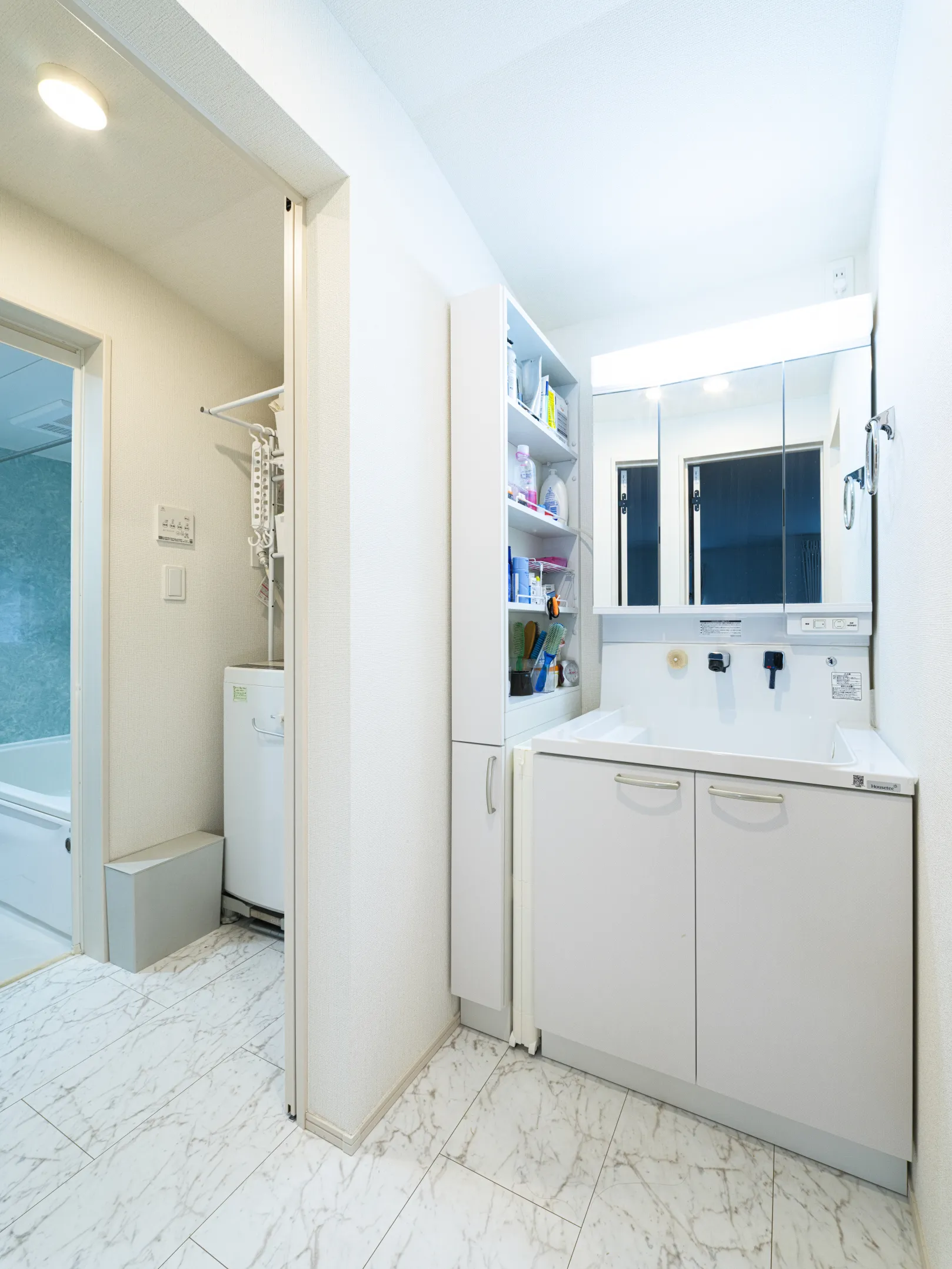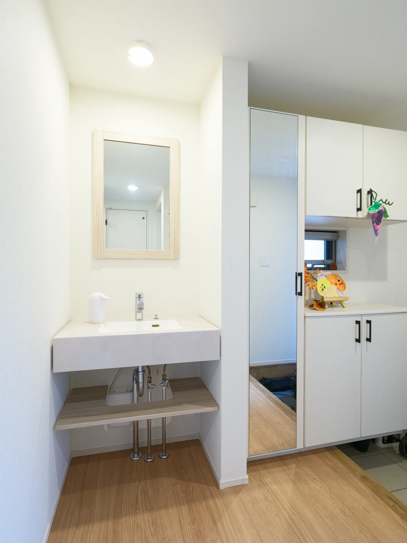 家族が入浴中でも洗面室を利用できるよう、脱衣室と洗面室を分けて設計されています。さらに、洗面化粧台の横には棚を設置し、限られたスペースを効率的に活用する工夫が施されています。