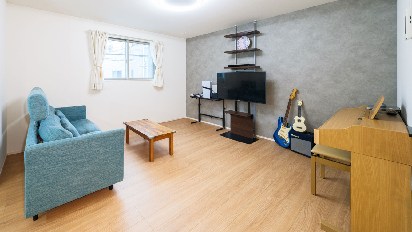 お子様たちは広々としたリビングでダンスを楽しんだり、走り回ったりと、元気いっぱいに過ごされています。また、ピアノは弾きたいときにすぐ演奏できるよう、便利な場所に設置されており、日々の生活に彩りを添えています。