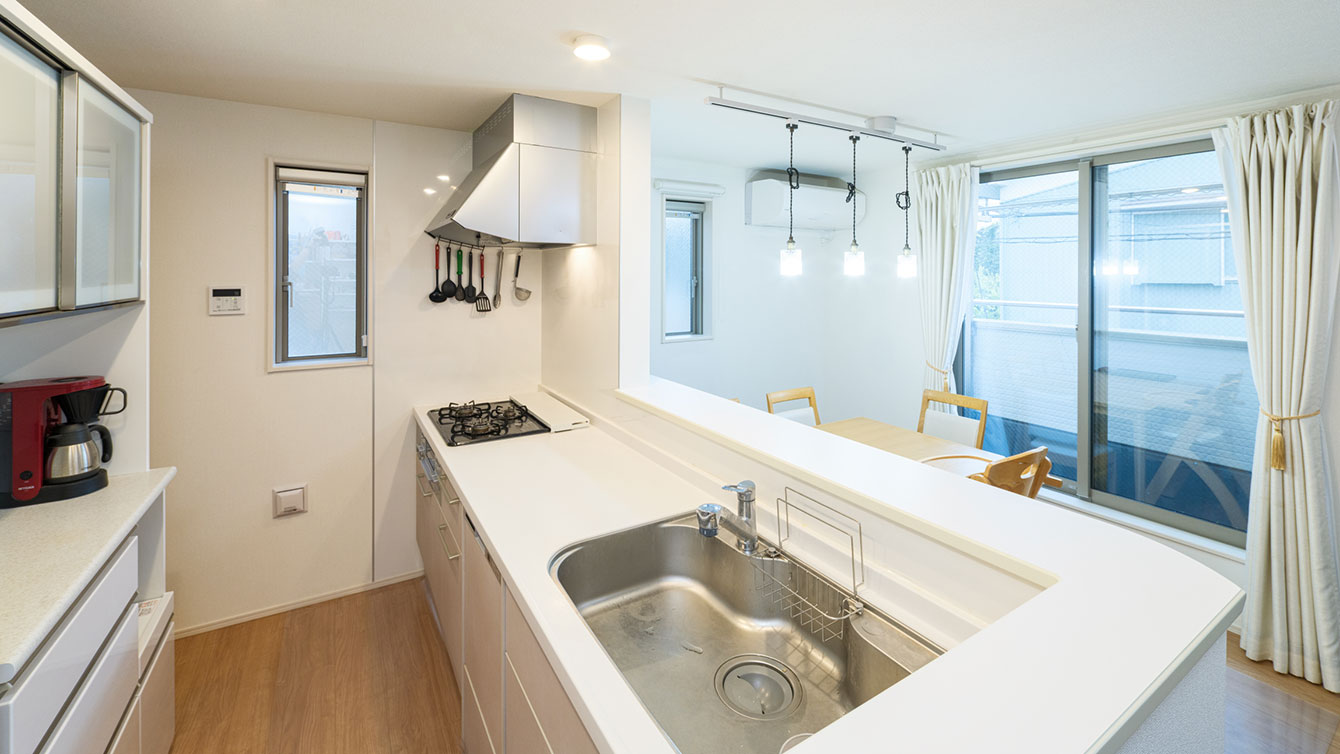 明るい対面式キッチンは、窓からの採光が心地よく、料理中も家族との会話が楽しめる快適な空間です。さらに、窓が見える設計により、天気の急変にも気づきやすい点が便利で、日々の暮らしをサポートしています。